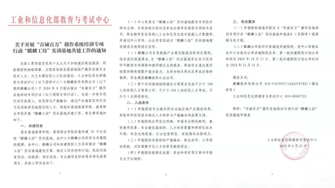 為深入貫徹落實黨的十九大關于加快建設制造強國、網絡強國的戰略部署,為國家培養急需緊缺國產操作系統專業技術人才,大力支撐信創人才隊伍建設,工業和信息化部教育與考試中心(以下簡稱中心)與麒麟軟件有限公司(以下簡稱麒麟軟件)于2020年8月聯合推出“百城百萬”操作系統培訓專項行動(以下簡稱專項行動)。為進一步將專項行動引向深入,切實深化產教融合,通過產業端真實項目實習實訓培養實戰型信創人才,現面向普通高等學校、高等職業學校開展“麒麟工坊”實訓基地共建工作。有關事項通知如下。