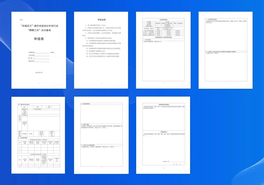 (一)申報院校填報并提交《“百城百萬”操作系統培訓專項行動“麒麟工坊”實訓基地申報表》(見附件)紙質版與電子版。