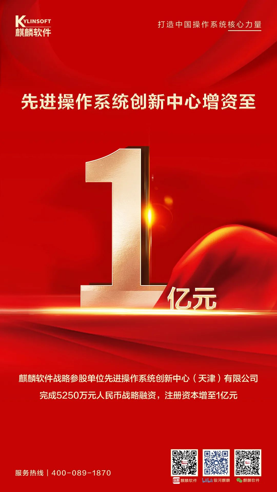 近日,麒麟軟件戰略參股單位先進操作系統創新中心(天津)有限公司(簡稱“創新中心”)完成5250萬元人民幣戰略融資,注冊資本增至1億元。本輪融資由麒麟軟件、奇安信戰略跟投,聯合天津海泰海河新動能產業基金合伙企業(有限合伙)、深圳市金蝶天燕云計算股份有限公司、廣州中望龍騰軟件股份有限公司、電子科技大學廣東電子信息工程研究院共同投資。