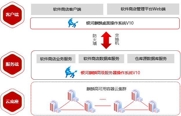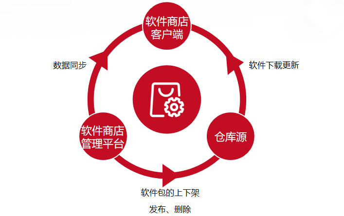 銀河麒麟軟件商店管理平臺(私有化版)V2.4(以下簡稱“平臺”)由軟件商店客戶端、軟件商店管理平臺、倉庫源三大模塊組成,管理員使用B/S架構的軟件商店管理平臺進行軟件的上架、下架、更新等運維管理。普通用戶使用C/S架構的軟件商店客戶端進行軟件下載、安裝,平臺在局域網和互聯網均可部署。借助平臺,用戶可以體驗從軟件上架、軟件包推倉、到最終客戶端下載安裝的一體化服務。