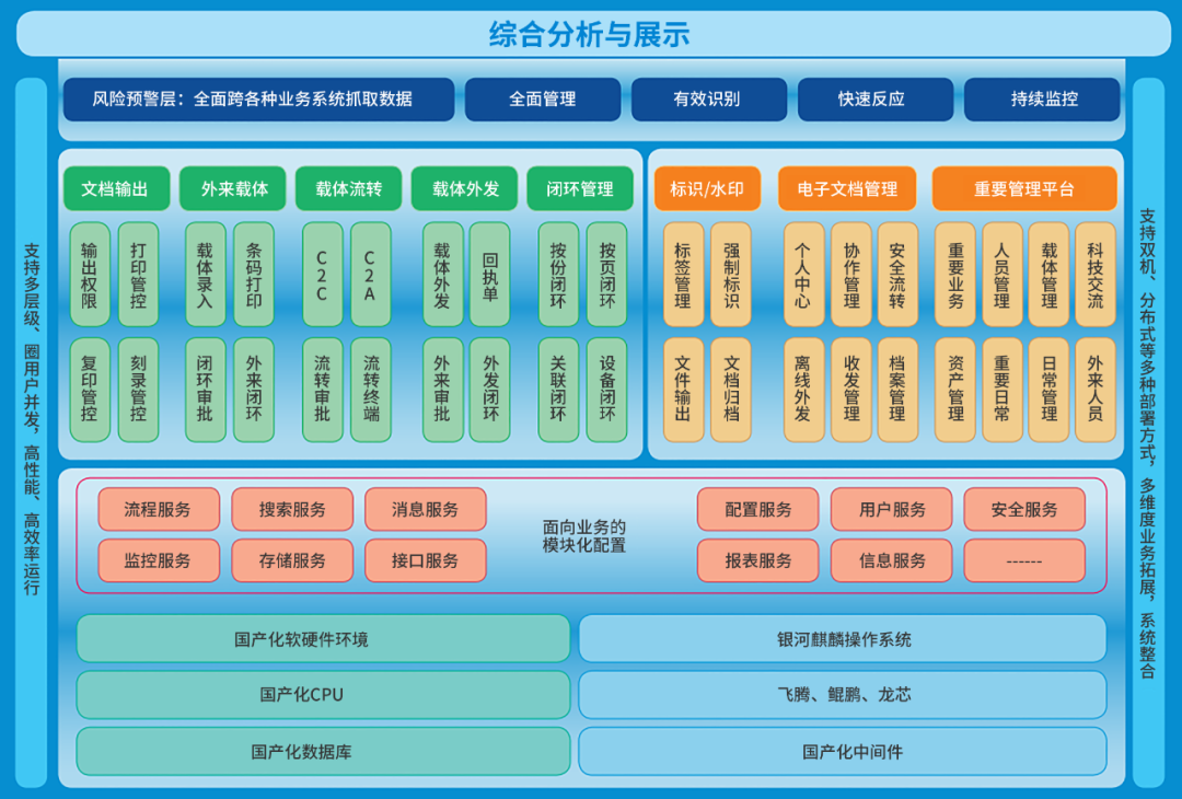 在某市中級人民法院智慧文印辦公建設中,采用本方案實現服務器及客戶端全面國產化創新,在銀河麒麟桌面操作系統及高級服務器操作系統上,對用戶單位的自有載體、外來載體、載體流轉、載體外發、載體閉環進行全生命周期管理,提升了重要的紙張及光盤的載體安全管理水平。
