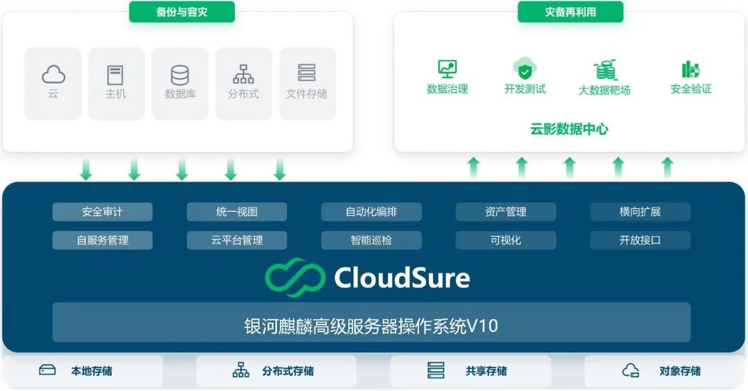 方案以銀河高級服務器操作系統V10為底層操作系統,搭載數騰云災備平臺CloudSure,采用分布式架構設計,以私有災備云形態為用戶提供災備與災備數據再利用服務。方案支持將用戶的任意云、分布式、容器等混合IT架構做統一保護,如果生產環境不可用,可通過CloudSure快速拉起容災虛擬機進行應急接管,保障業務連續性。