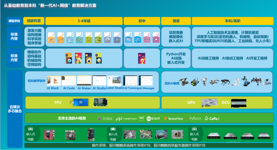 AI廣泛的應用場景催生了大量的人才需求,對我國教育行業也提出了新的要求,如何提高學生的信息技術水平和AI素養已成為教育領域的重要任務。松科智能攜手麒麟軟件,從基礎教育到本科教育,提供“銀河麒麟OS+AI”的教育解決方案,幫助學生獲取信息技術和人工智能的知識和技能,以適應未來社會的需求。