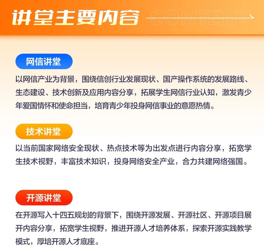 為深入貫徹強國戰略,弘揚愛國主義,厚植家國情懷,作為中國操作系統核心力量,麒麟軟件立足強國建設、網信人才自主培養,匯智聚力推出2023網信思政大講堂,從產業、科技、開源等重要領域,為全國各大高校帶來“新學年第一課”,提升同學們科技素養、專業知識的同時,激勵青少年以昂揚之姿,為科技自強自立、強國建設、民族復興而不懈奮斗。