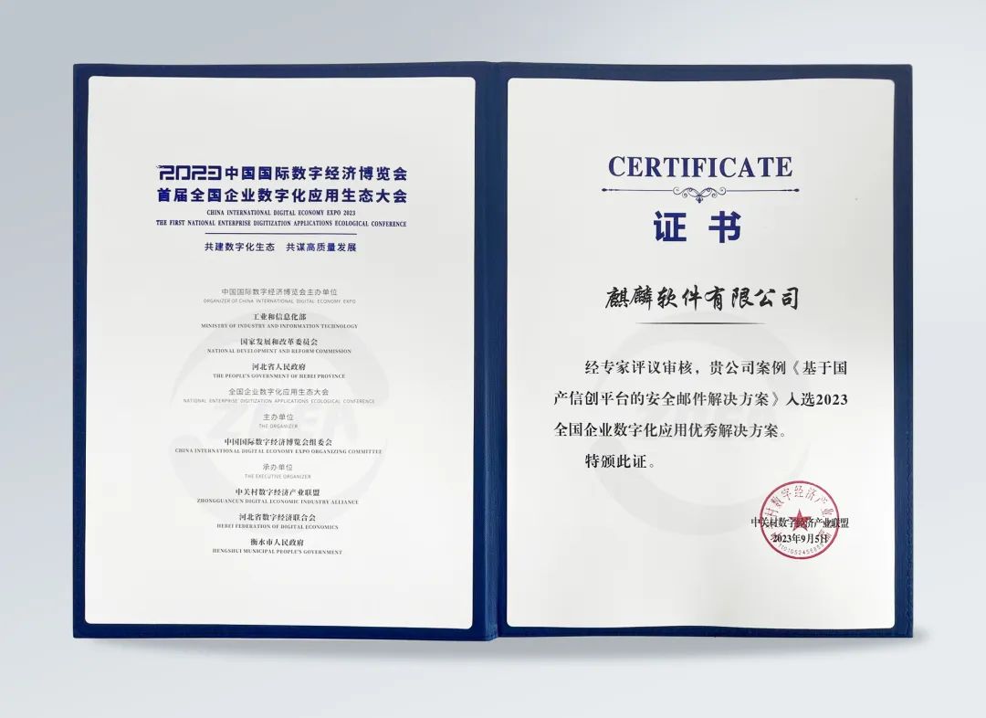 河北省人大常委會副主任、衡水市委書記吳曉華出席大會并致辭。工業和信息化部原副部長楊學山,原國家糧食儲備局局長、中關村數字經濟產業聯盟首任理事長高鐵生,中國工程院院士張宏科等共同出席了本次大會。大會上揭曉了2023全國企業數字化應用優秀解決方案等重要獎項,麒麟軟件《基于國產信創平臺的安全郵件解決方案》憑借多年來在各行業數字化建設中豐富的成功實踐,成功獲評“2023全國企業數字化應用優秀解決方案”。