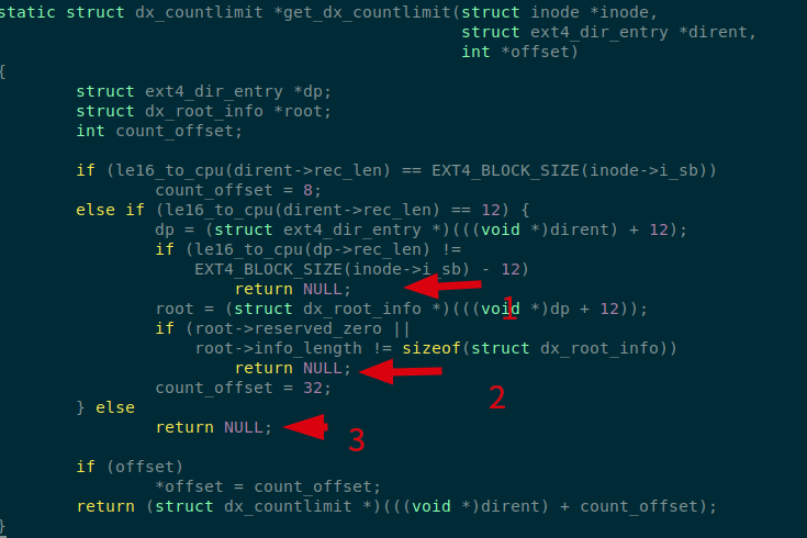 經過層層定位,發現ext4 get_dx_countlimit()函數有三處代碼可能導致問題的產生。下圖函數主要是在校驗fakedirent -> rec_len的長度,在不符合規范的情況下可能返回空值。
