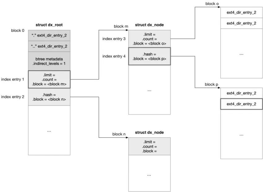 ext4 中目錄采用了B+樹(htree)結構來加速查找過程。這其中將節點劃分為了根節點和中間節點,而fakedirent 是每個節點的第一個entry,用于記錄整個節點的大小。