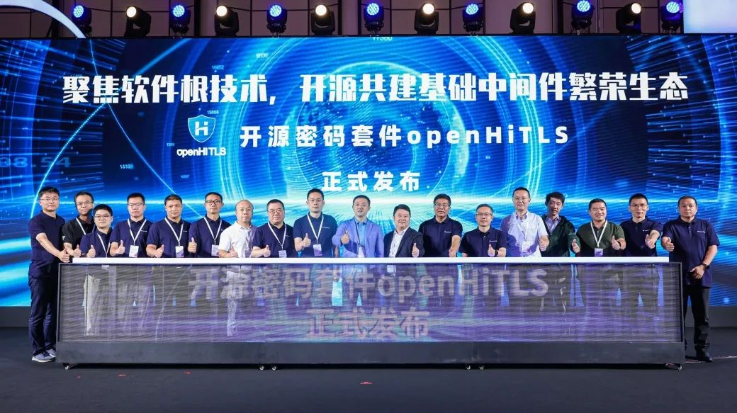 開源密碼套件openHiTLS正式發布,麒麟軟件作為社區初創會員,麒麟軟件副總裁楊詔鈞(左三)參與了發布啟動儀式。