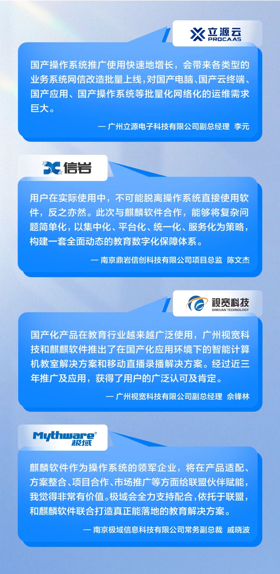 不拒眾流,方為江海。麒麟軟件堅持開放創新,始終重視與生態伙伴的深度協作,此次教育數字化運管監控聯盟的成立正是麒麟軟件生態高質量建設的又一重要舉措。麒麟軟件目前已在金融機具、安全應用、整機廠商等多個領域,通過建設生態聯盟、使能成員伙伴,推進國產操作系統生態體系向縱深發展,為行業信息化建設轉型升級提供有力支撐。