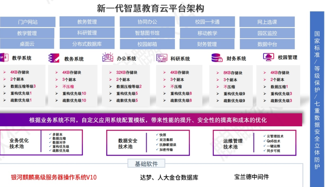 基于銀河麒麟操作系統和安超國產化云底座的智慧教育云解決方案,聚焦業務、安全雙視角,構建完善的云、網、安產品體系,助力學校及各類教育機構進行網信基底、安全能力與IT基礎設施融合的最佳實踐。通過對原有異構IT基礎設施的統一納管、升級和優化,在按需實現國產化局部或全局遷移的基礎上,提升跨部門、跨校區IT業務的可用性、穩定性、效率和靈活性,同時關注校園數據庫和物理全域管理各環節的差異化特性,打造安全防護、分析、決策、處置一體化的動態網絡安全體系,真正實現智慧教育全方位安全高效轉型。