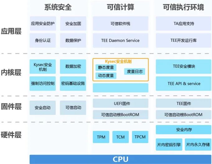 銀河麒麟云底座操作系統V10支持核內核外一體化內生安全體系、安全審計、安全加固、國密算法組件等多重安全聯防機制,并支持通用安全和可信計算,系統性地增強HostOS底層安全。