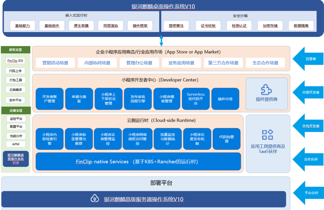 方案采用的凡泰極客小程序平臺FinClip與銀河麒麟操作系統完美兼容,可在國產瘦終端、一體機、整機上實現部署,讓企業移動App、電腦、電視、車載主機上的自有應用都能具備運行小程序的能力,并且提供小程序全生命周期管理。此外,FinClip不僅兼容微信小程序語法,同時提供全套的的小程序開發管理套件,開發者不需要學習新的語法和框架,使用FinClip Studio、小程序管理后臺、小程序開發文檔、FinClip App就能低成本高質量地完成從開發測試到預覽部署的全部工作。