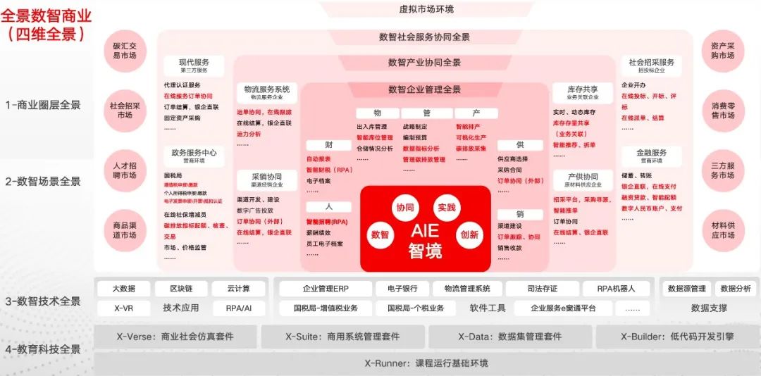 AIE智境數智商業綜合實踐平臺是以數字商業社會全景為基礎構建的一體化綜合實踐平臺。平臺運用數字孿生、VR、AI等新一代教育技術,充分融合大數據、人工智能、區塊鏈等新一代企業級數字化技術,搭建了數字企業、數字產業鏈、數字商業社會的三層全景數字孿生環境,構建了以先進制造業、現代農業、現代服務業為基礎業態的多行業仿真模型。