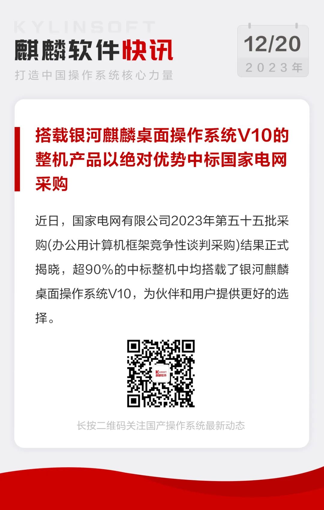 2023年7月,國家電網啟動本項目采購的POC測試,九成報名參與的整機伙伴均選擇搭載銀河麒麟桌面操作系統進行測試。該項目將采購辦公用臺式機和筆記本共計62000余套,華為終端、聯想開天、浪潮計算機、同方計算機等伙伴成功入選,而中標整機中采用銀河麒麟桌面操作系統的占比超過90%。麒麟軟件將以優異的產品性能和完善的服務支撐能力賦能伙伴服務用戶。