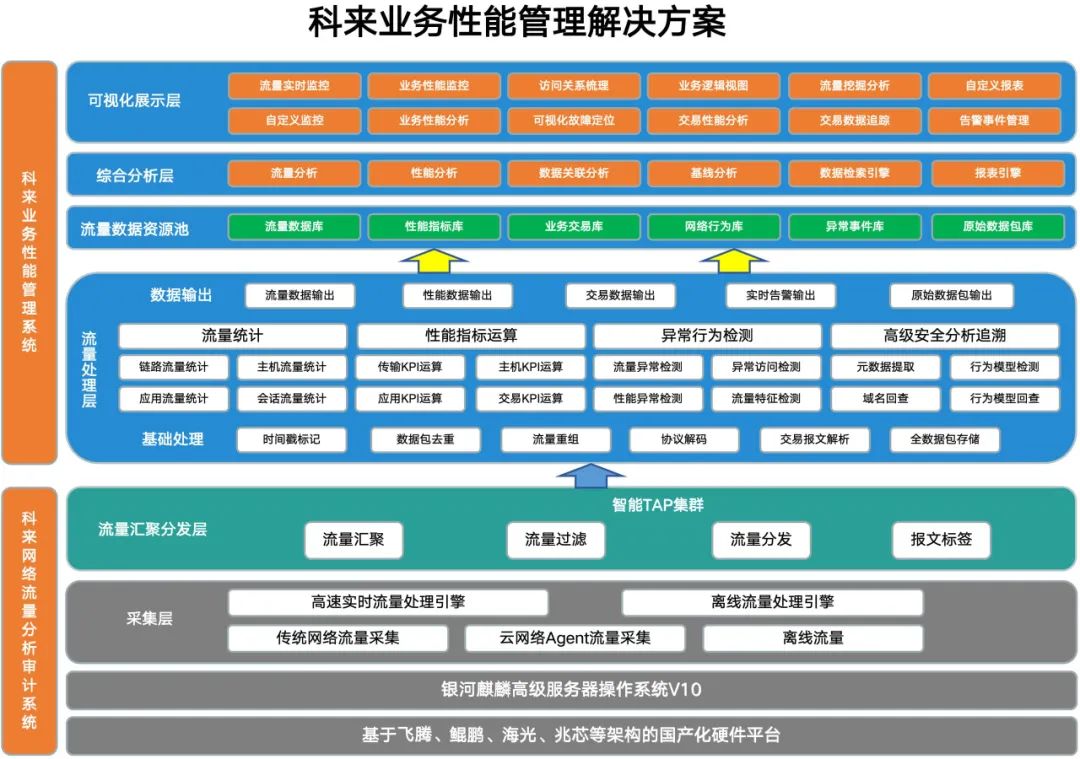 針對當前信息網絡系統運維所面臨的挑戰,科來網絡技術股份有限公司(以下簡稱“科來”)基于其在網絡流量分析領域的技術實力,結合銀河麒麟高級服務器操作系統在性能、兼容性和適配性等方面的優勢,推出業務性能管理解決方案。方案定位于智能運維領域,圍繞客戶的業務網絡提供全量采集、存儲、分析及實時監控,實現快速故障定位。
