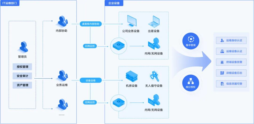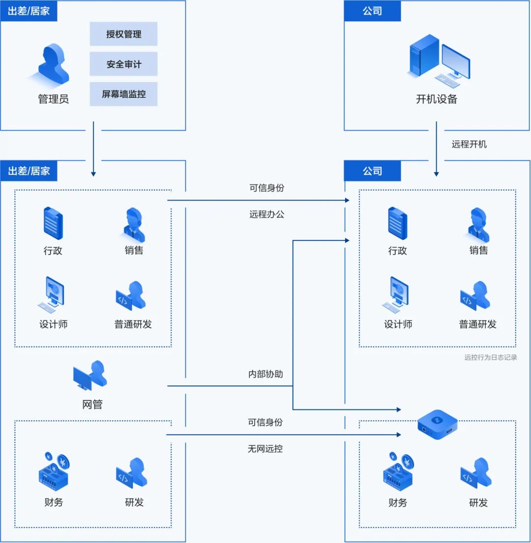 以遠程桌面作為技術手段,為企業提供遠程辦公工具以及對應的管理體系。員工通過向日葵遠程控制使用可信身份遠程訪問工作電腦,執行各種需要在工作電腦上進行的操作。也可結合開機硬件實現遠程喚醒工作電腦,進行遠程辦公。同時管理員可以對整個遠程辦公體系進行建設和管理,以授權管理、安全審計、屏幕墻等具體功能為手段強化管理觸達能力。