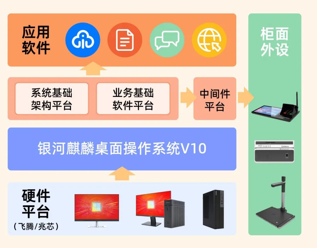 ? 銀河麒麟操作系統具備完善的安全機制,實現自主創新,100%支持柜面業務所需的外設。