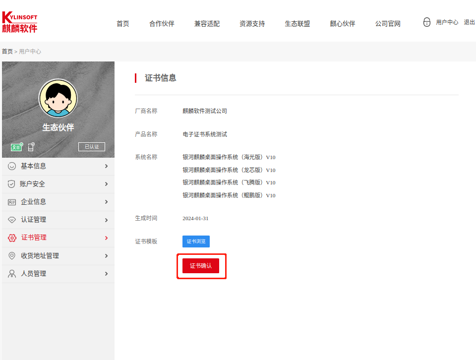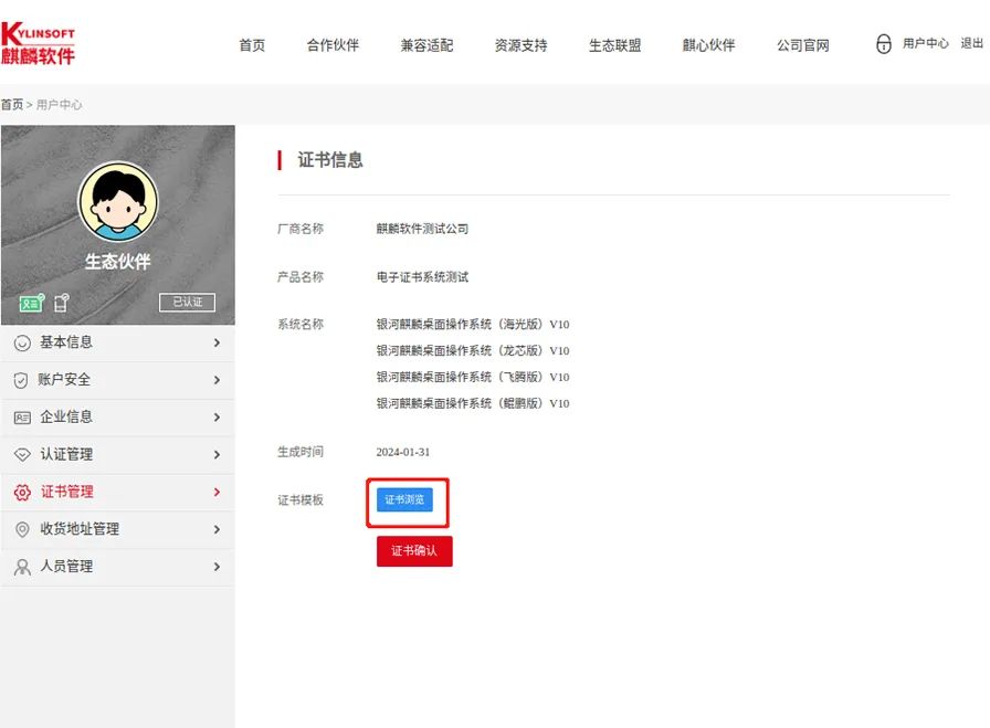 證書樣式確認無誤后,生態伙伴點擊【證書確認】按鈕,即可完成證書內容的確認。生態伙伴再次查看證書記錄即可獲得帶有“麒麟軟件生態適配專用章”的證書。若證書信息不準確,可聯系生態對接人修訂。