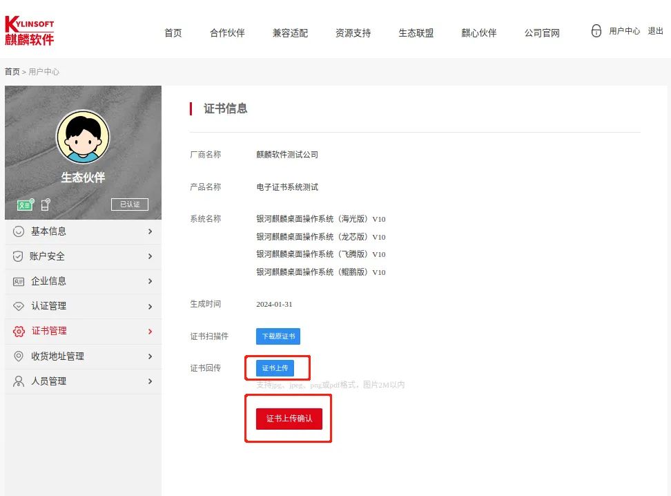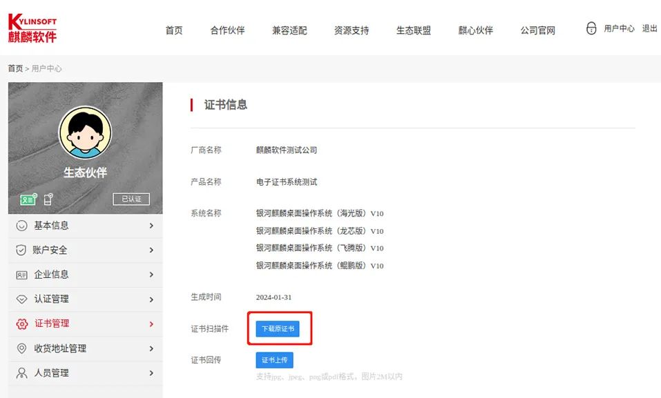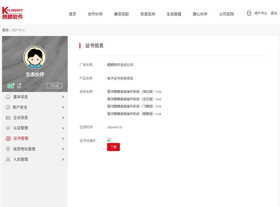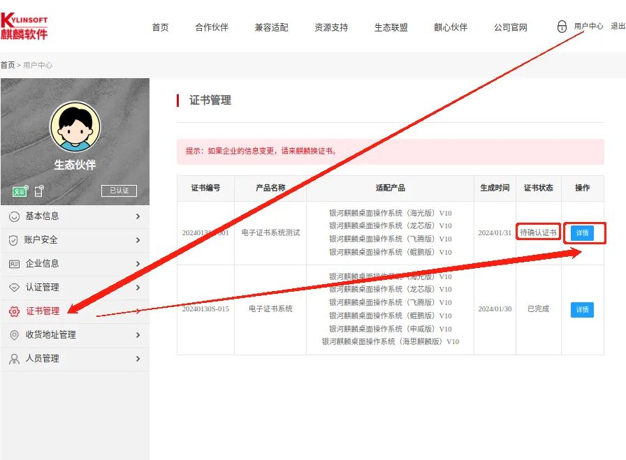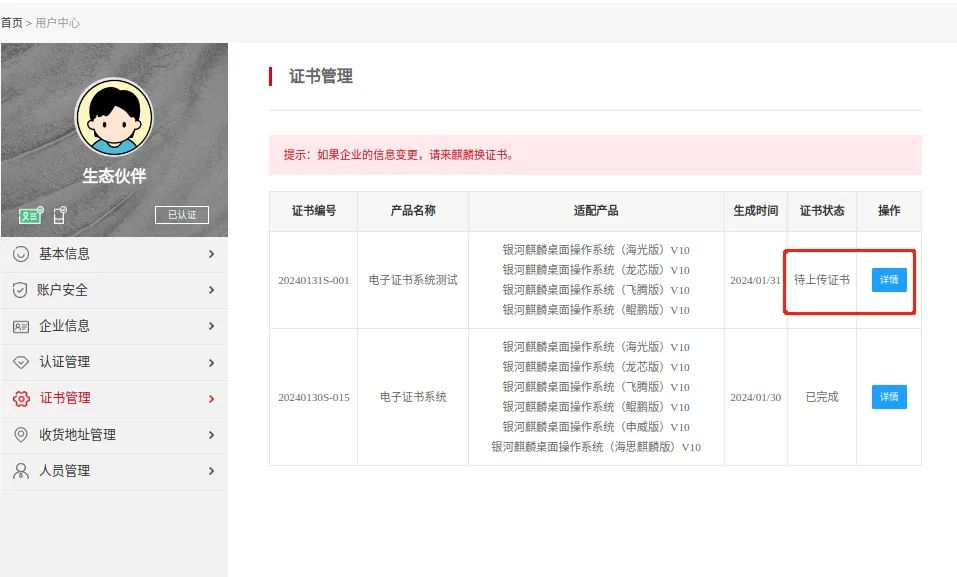生態伙伴進入【麒麟軟件官網】——【生態適配】——【用戶中心】——【證書管理】,找到對應的證書記錄,點擊詳情可查看證書格式與內容信息。