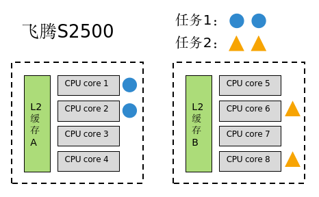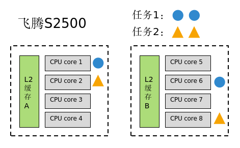 在飛騰S2500服務器中,在與圖2相同的CPU綁核情況下,任務1和任務2仍會出現L2緩存爭搶,觸發L2 Cache Miss,導致某個任務性能波動,綁核的優化效果未能充分發揮。