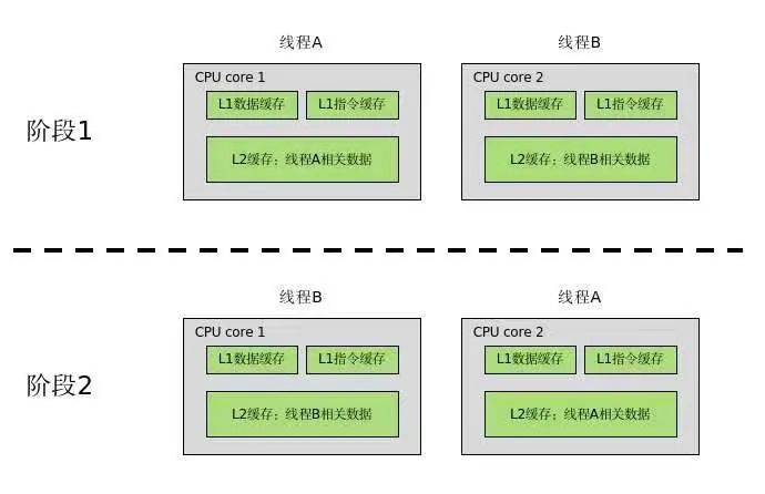 圖中展示了線程在CPU core之間調度的場景。在階段1,線程A和B的數據加載到各自核心的L2緩存。若未進行綁核,在階段2,線程A和B可能交換運行的CPU core,導致L2緩存數據更新,造成cache miss,帶來性能開銷。而進行綁核操作則始終維持在階段1狀態,避免L2緩存數據更新,提升性能。