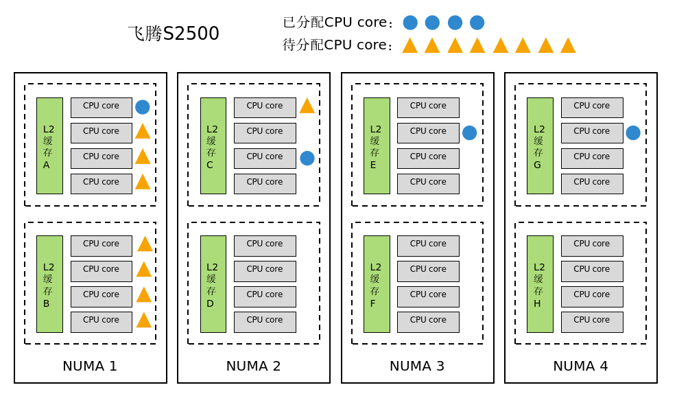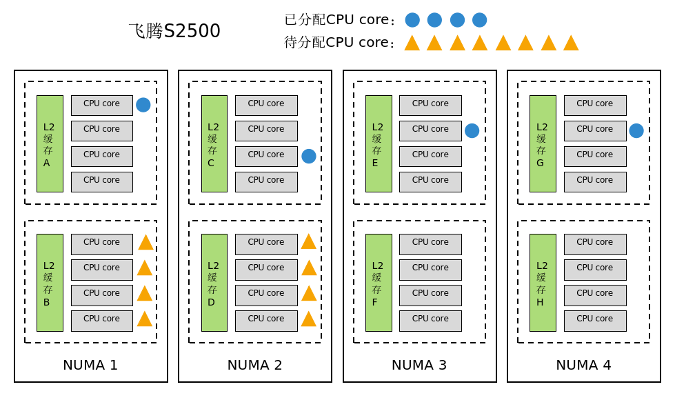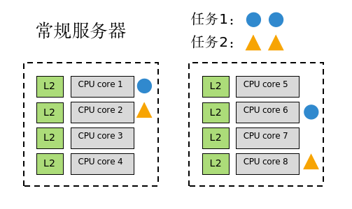 通常CPU core與L2緩存是一對一的關系(見圖1),而S2500每4個CPU core共享一個L2緩存。引發了新的問題:若同一個L2緩存中的4個CPU core綁定不同任務線程,這些線程在運行過程中會爭搶L2緩存,造成性能波動,使得綁核效果無法完全發揮。