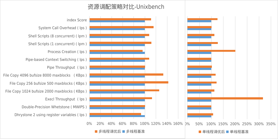 經過測試,優化后的kubelet代碼能夠滿足要求,綁核后提升線程運行效率和穩定性。以4C4G為例,在已有CPU資源被其他Pod占用的情況下部署新Pod,測試Unixbench指標性能對比,如圖8所示: