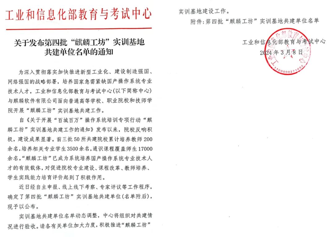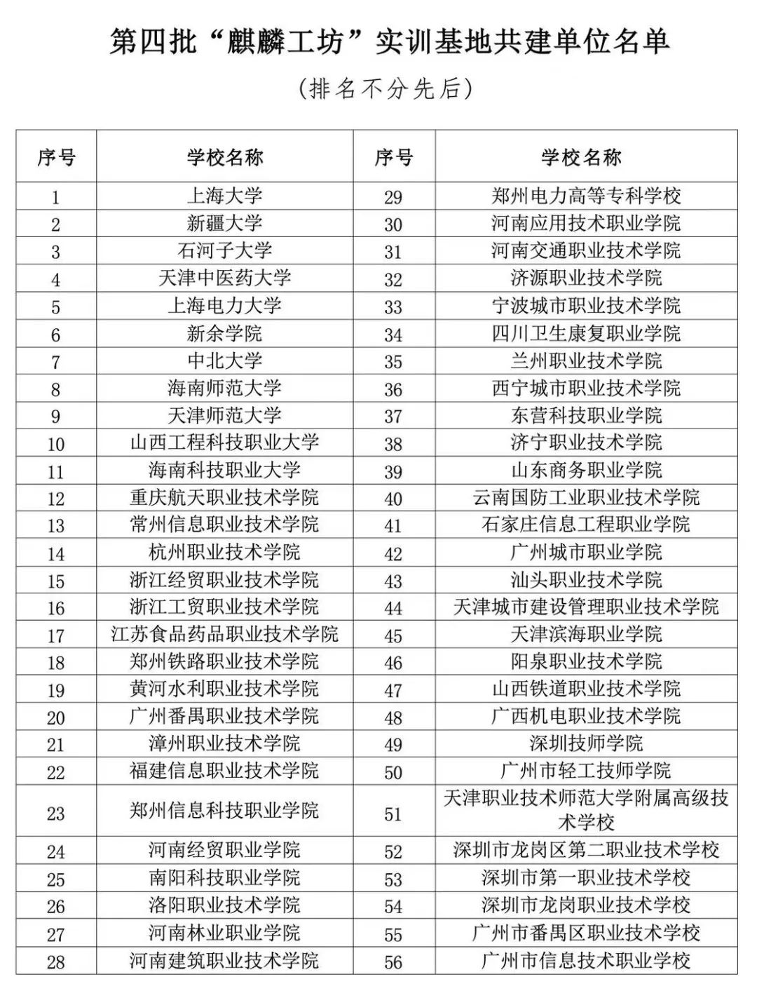 近日經自主申報、線上線下考察、專家評議等工作程序,確定了第四批“麒麟工坊”實訓基地共建單位(名單附后),現予以公布。