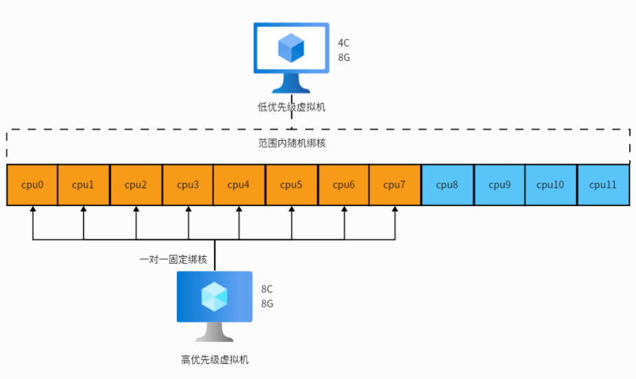 CPU綁核要求 | 一對一獨占式綁核 | 范圍自由選取,選取范圍包括高優先級虛擬機CPU范圍 |