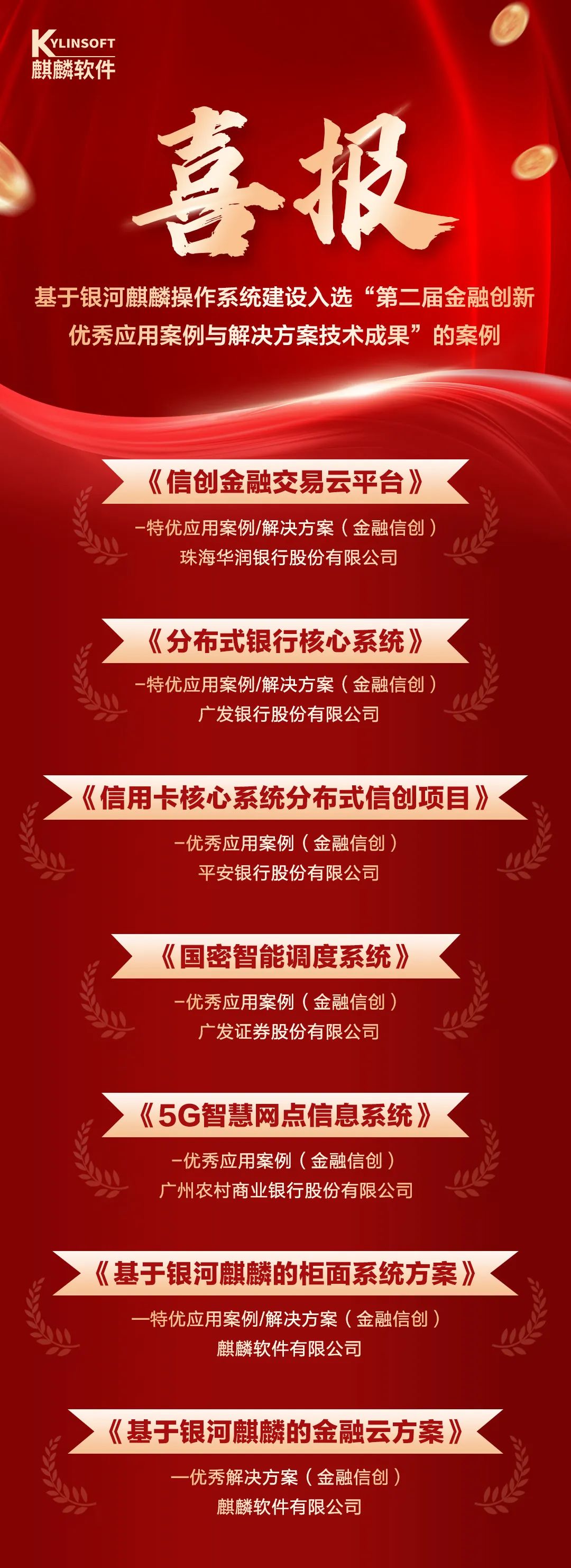 自主創新是金融信息化高質量發展的“主旋律”。近日,由廣東省粵港澳合作促進會金融專業委員會組織開展的第二屆金融創新優秀應用案例與解決方案技術成果評定結果正式公布。支持金融行業國產化建設,麒麟軟件助力多名用戶獲得殊榮!此外,麒麟軟件申報的相關解決方案也榮耀登榜。