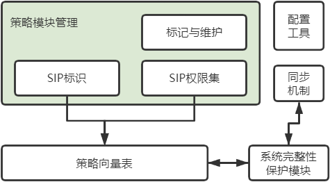 系統完整性保護模塊是采用核內外安全一體化設計,遵守機制與策略分離原則,基于應用標記將系統基礎資源進行分類分層劃分,通過對系統資源訪問權限管控,從而實現對系統資源完整性保護。其主要由內核系統完整性保護模塊、內核策略向量表、策略管理模塊、標記同步機制、系統初始化模塊等組件組成。(如圖1所示)
