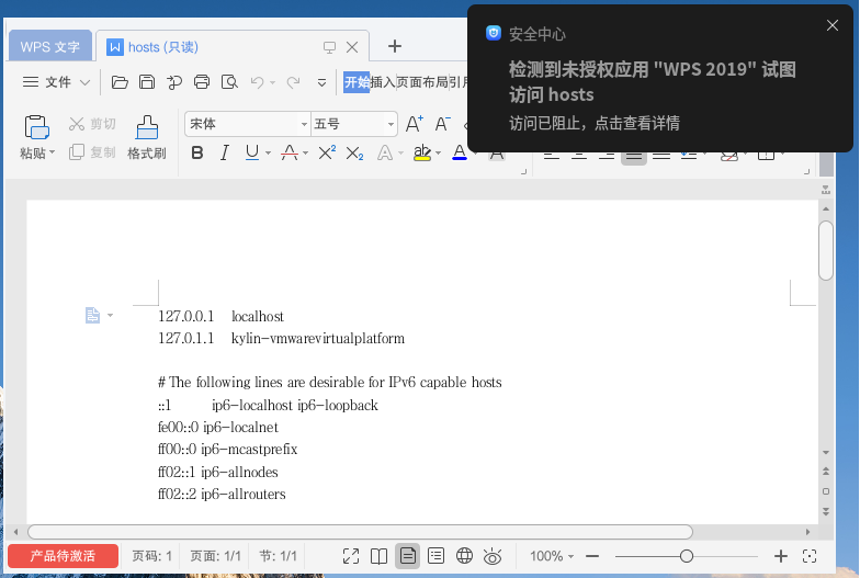 在我們實際操作中,若使用WPS文檔編輯系統配置文件host,系統則會阻止該操作并提供消息通知。(如圖2所示)