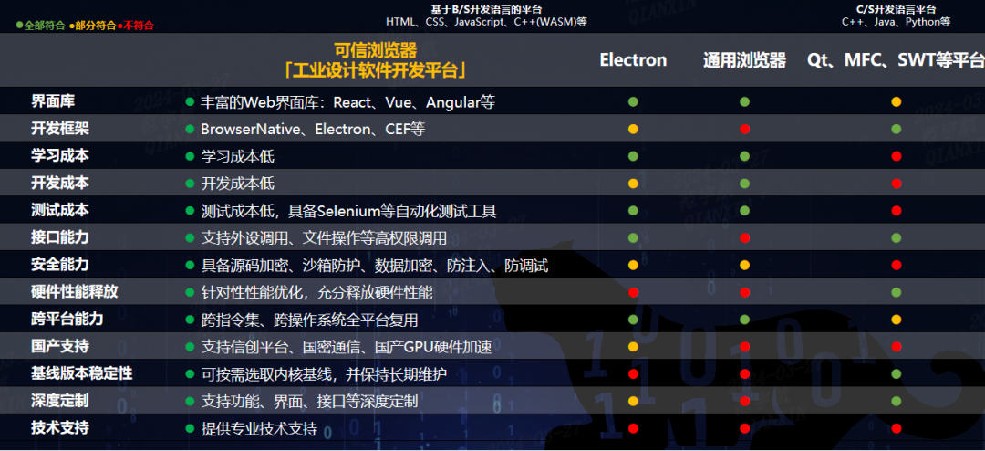 開發平臺與通用瀏覽器和其他B/S開發平臺相比,在開發框架支持度、硬件性能釋放、國產平臺支持等方面展現出顯著優勢。
