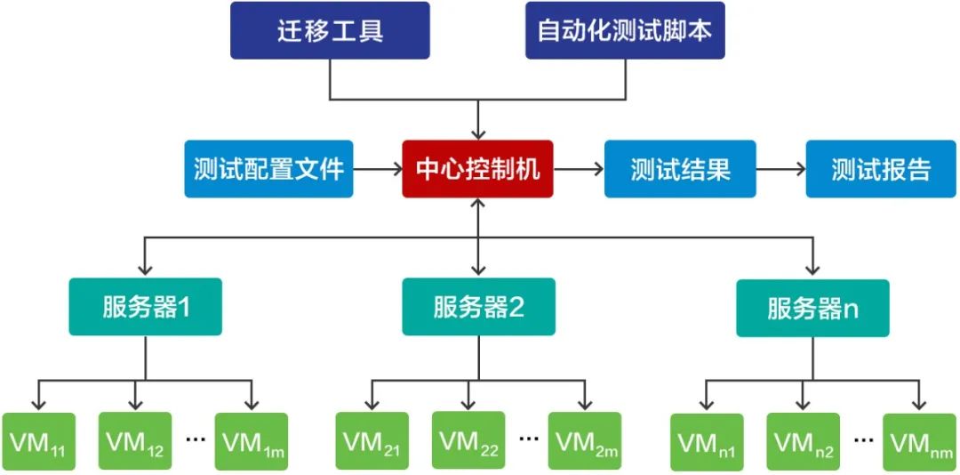 該平臺通過一臺中心控制機和大量測試機構成,中心控制機中需要包含遷移工具和自動化測試腳本以及測試所需的配置文件。通過控制機下發遷移工具和自動化測試腳本到測試機,進行CentOS/RHEL系統遷移到麒麟操作系統,等待測試機測試結束之后控制機將所有測試結果進行收集,將每個測試機的測試結果生成詳細報告,同時將所有的測試機的測試結果匯總成總報告。