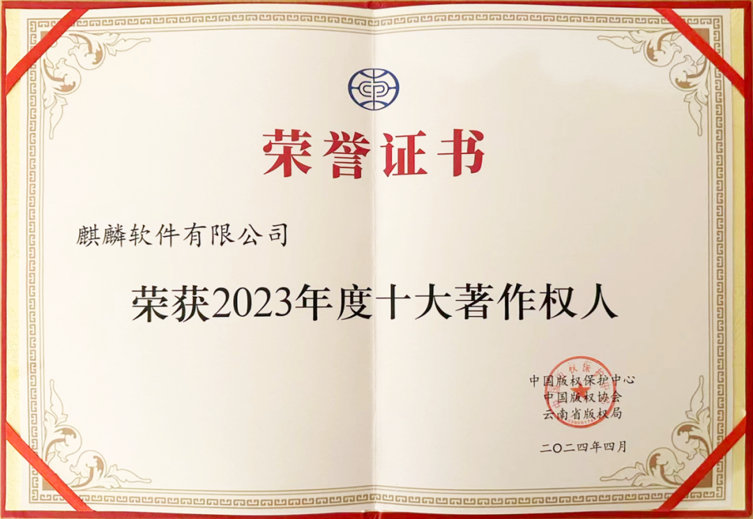 4月23日,由中國版權保護中心、中國版權協會、云南省版權局共同主辦的2023年度十大著作權人發布會在第三屆全民閱讀大會上舉行。麒麟軟件受邀參加,捧回“2023年度十大著作權人”榮譽稱號。