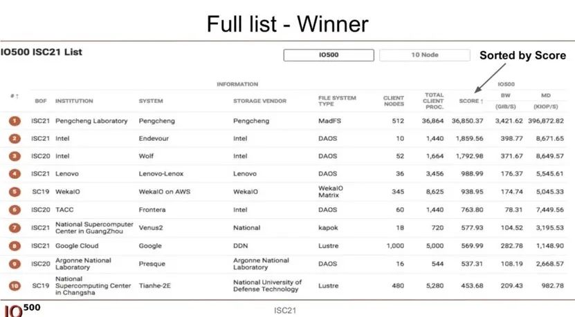 IO500 ISC21 全系統輸入輸出性能排行榜