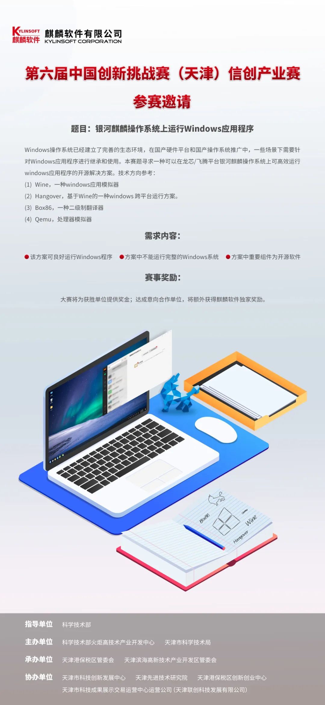 8月6日,第六屆中國創新挑戰賽(天津)信創產業賽啟動暨技術需求發布會在天津濱海高新區召開。此次賽事由國家科技部指導,科技部火炬中心與天津市科技局共同主辦,天津濱海高新技術產業開發區管委會承辦。麒麟軟件作為大賽需求方,現向各企業、高校及個人征集技術需求方案。