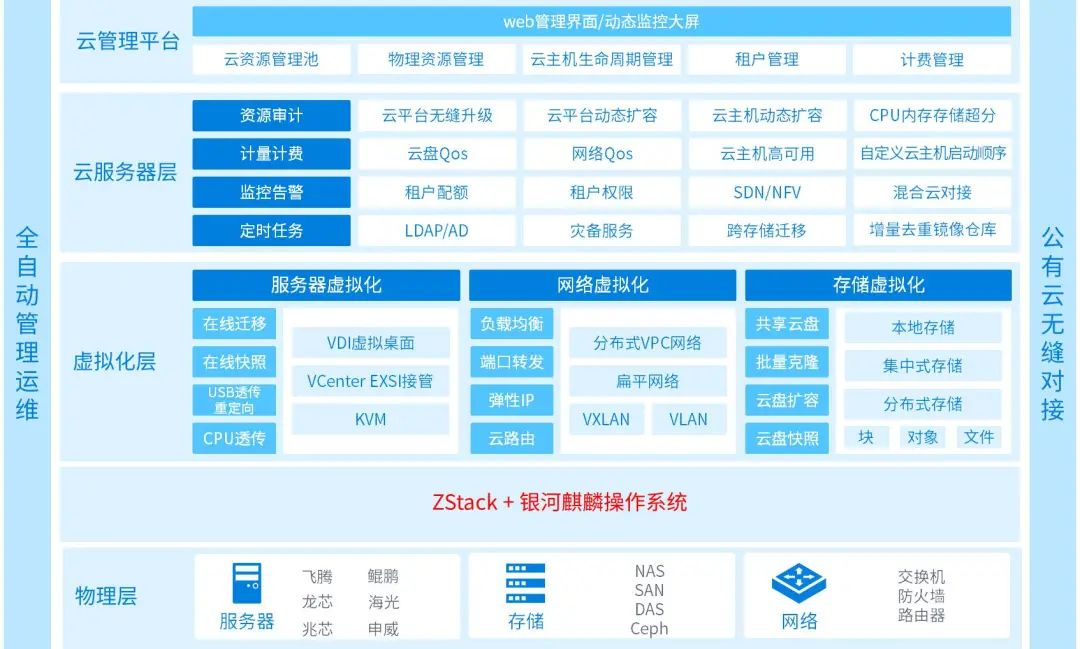 “麒麟軟件&ZStack信創云”可以屏蔽底層基礎設施的架構差異,支持多種異構資源統一管理,并增加了對各類硬件資源池的共享適配,極大降低了用戶使用云平臺的技術門檻和部署成本,成功做到了使平臺開箱即用的效果。