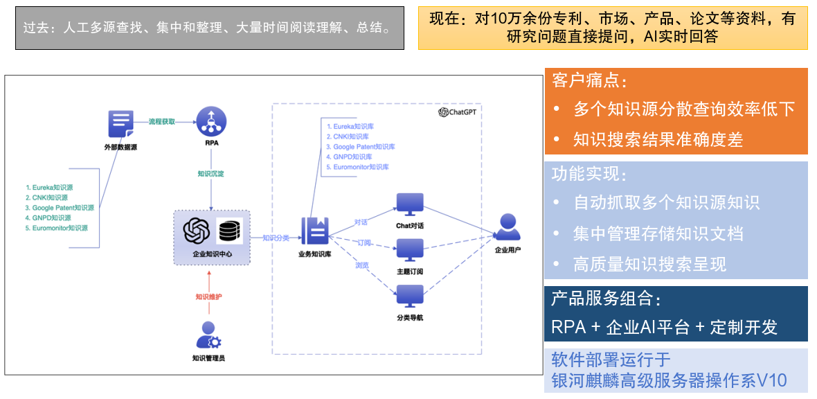 本方案圍繞企業私有數據,讓每個企業擁有基于專屬數據和大模型支撐的企業知識中臺,建立企業知識從構建、應用、更新、沉淀的閉環,系統部署運行于銀河麒麟高級服務器操作系統V10,帶來知識復用的變革。在制造業、泛金融、生命科學、快消零售等行業,適用于知識分享、產品研發、行業分析、智能客服、專業服務等多種場景。