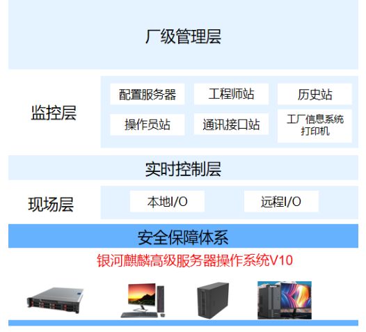 基于銀河麒麟操作系統的中國長城自主創新DCS方案自上而下由現場層、實時控制層、監控層、廠級管理層四個層級架構組成,由中國電子旗下企業基于PK體系平臺,運用可信計算、國密算法等技術,研發出的具有完全自主知識產權的全自主化產品,多項自主創新產品填補了國內空白,有效涵蓋信息監控采集、監控層、控制層等應用場景。方案融合智能補償和自校驗算法,顯著提升I/O模件精度及長期運行穩定度,能夠實現對發電行業的鍋爐、汽輪機、發電機的全覆蓋控制。